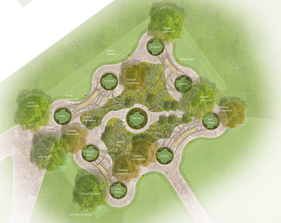 Relating to the overarching theme of the K-Wave, each of the outer columns symbolizes a key contributing factor that initiated or supports the cultural phenomenon. Each factor is assigned a specific color, represented by a particular variety of iris. The center unites these colors. The transition between inside and outside is meant to be soft and seamless. For this reason, grasses that sway in the wind like waves are primarily used in the transition zone.